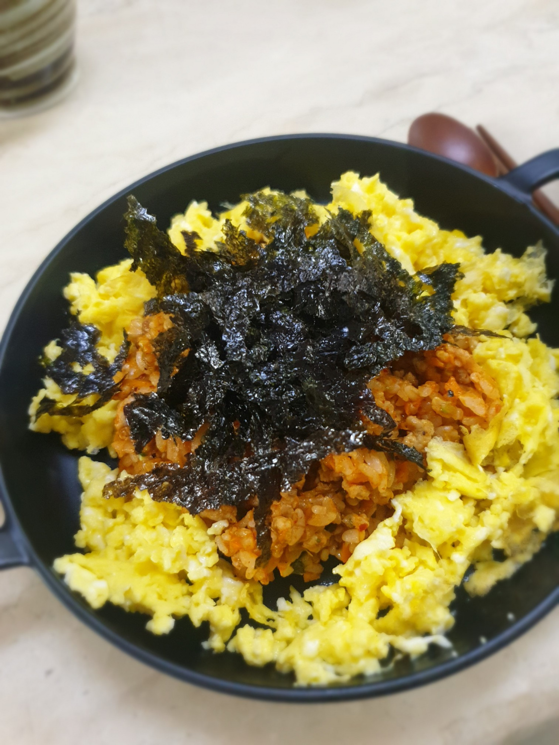 Prepare a bowl of warm cooked rice and add it to the pan with the kimchi and vegetable mixture. Stir-fry everything together until well combined, ensuring each grain of rice is coated with the delicious flavors. Just before turning off the heat, drizzle in 1 Tbsp of sesame oil for a nutty aroma. Top the finished kimchi fried rice generously with the soft scrambled eggs and crumbled seaweed for a complete, family-favorite dish. Enjoy your meal!^^