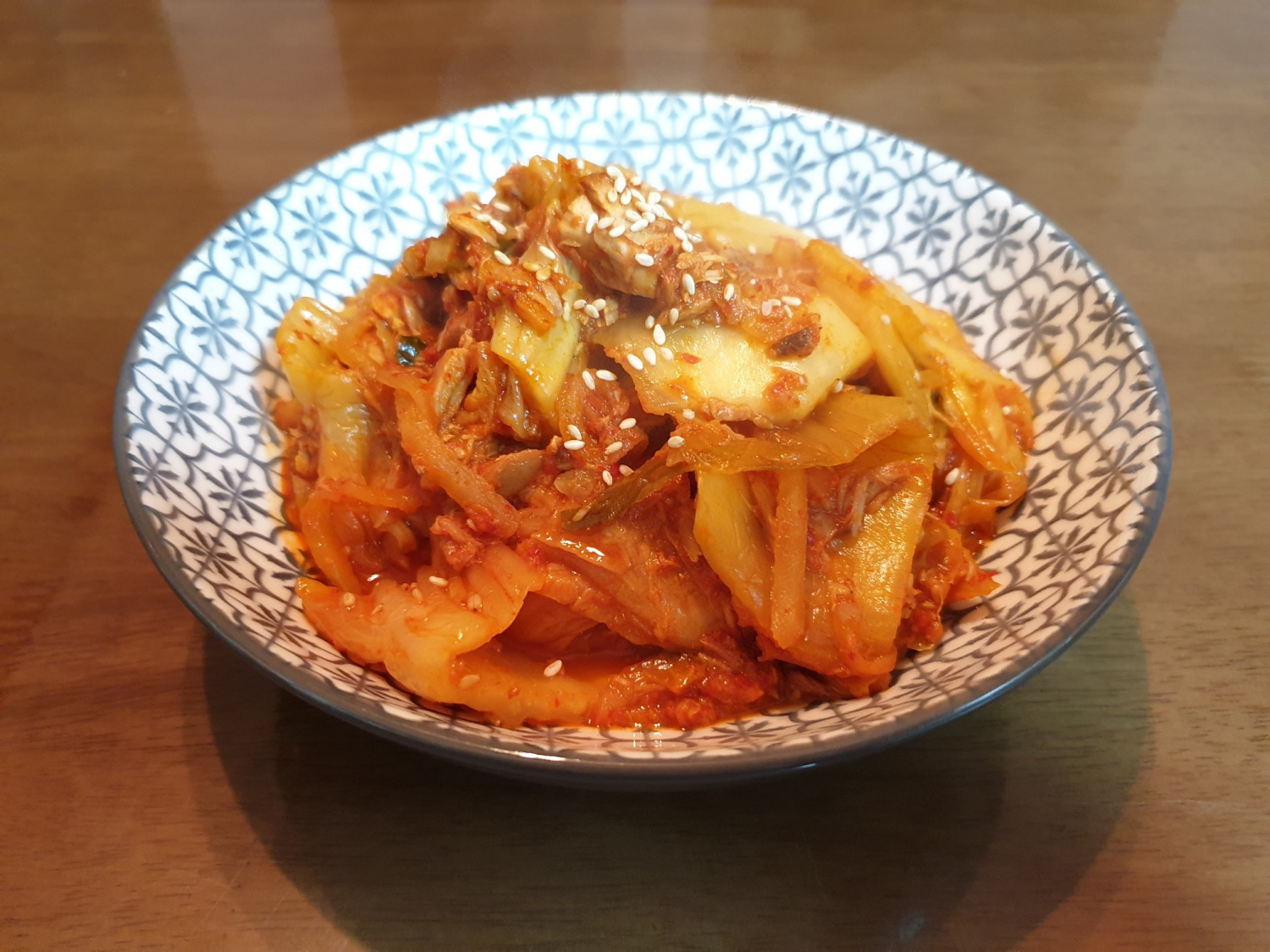 The first step to making a delicious Kimchi Tuna Stir-fry! Wash one head of kimchi thoroughly and chop it into bite-sized pieces (about 2-3 cm wide). Cutting it too small might cause it to break apart during cooking, so aim for a moderate size. Using aged kimchi will give it a deeper flavor.