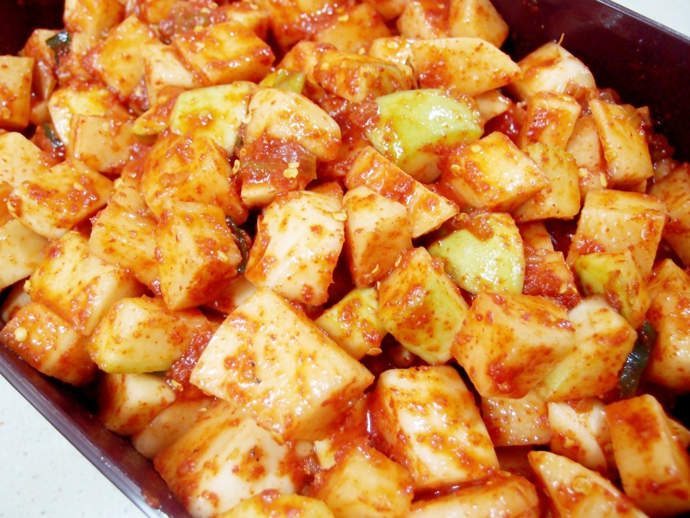 Add the fermented kimchi paste to the drained radish. Gently mix everything together, ensuring the paste evenly coats all the radish cubes.