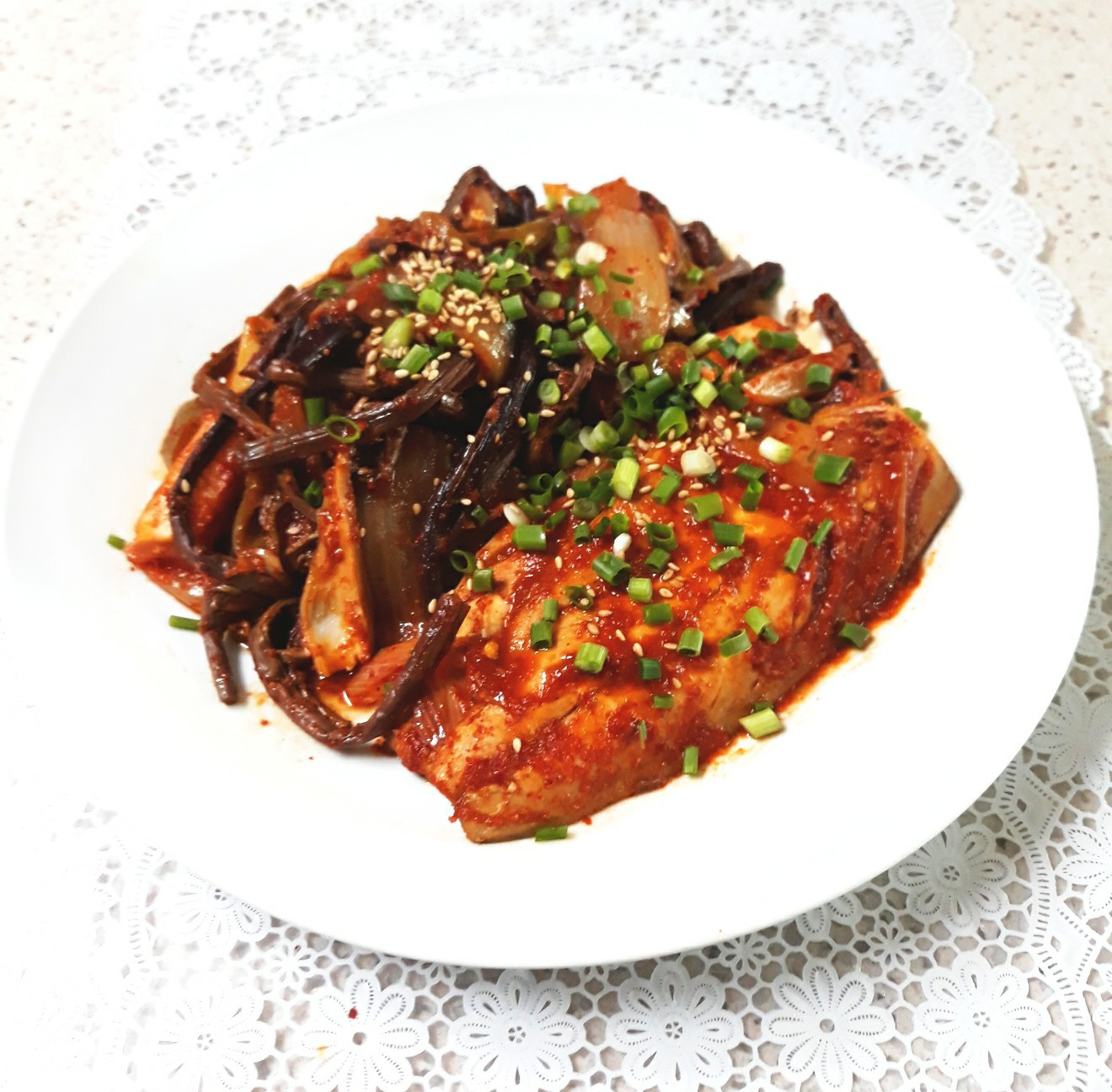 Transfer the beautifully simmered Mackerel and Fernbrake Stew to a serving dish. Garnish generously with the chopped green onion and sesame seeds for a final touch. Your delicious Mackerel and Fernbrake Stew is ready to be enjoyed with a steaming bowl of rice!