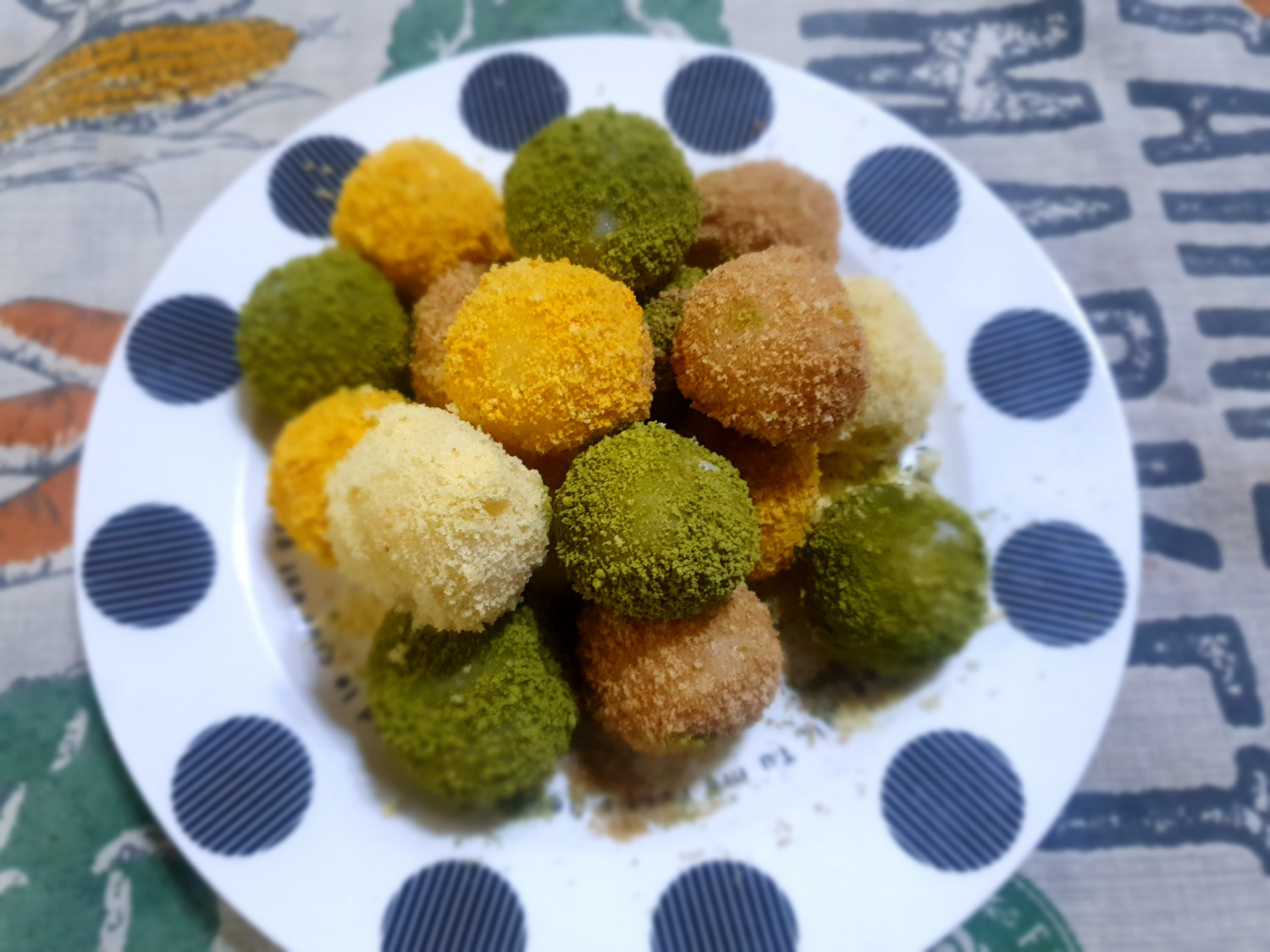 Finally, roll the drained dango in each of the prepared toppings (Castella, pumpkin, green tea, and cinnamon) until they are evenly coated. Coating them in beautiful colors will make your dango look even more appealing. Enjoy your delicious dango!