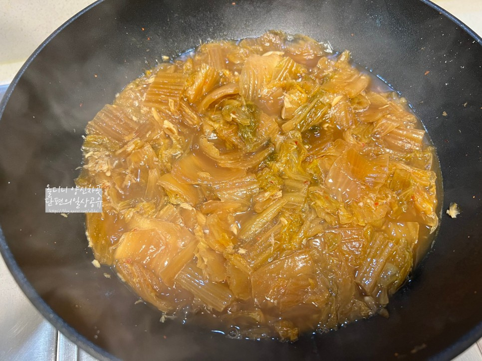 Add the chopped mellow kimchi to the pan with the fragrant garlic and perilla oil, and stir-fry together. Once the kimchi has softened slightly, pour in 500ml of anchovy broth. If you don’t have anchovy broth, water can be used. When using water, consider adding 0.5 tablespoon of Dashida (seasoning powder) to enhance the umami flavor.