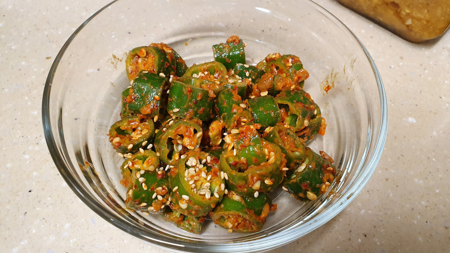 Add the sliced chilies to the prepared doenjang mixture. Gently toss them using your hands or a spoon, ensuring not to mash the chilies. Coat each piece evenly with the seasoning for a balanced flavor.