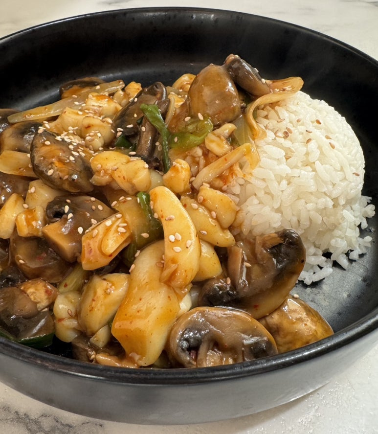 Spoon a generous portion of hot, steamed rice into a serving bowl. Top the rice with the savory mushroom and squid stir-fry.