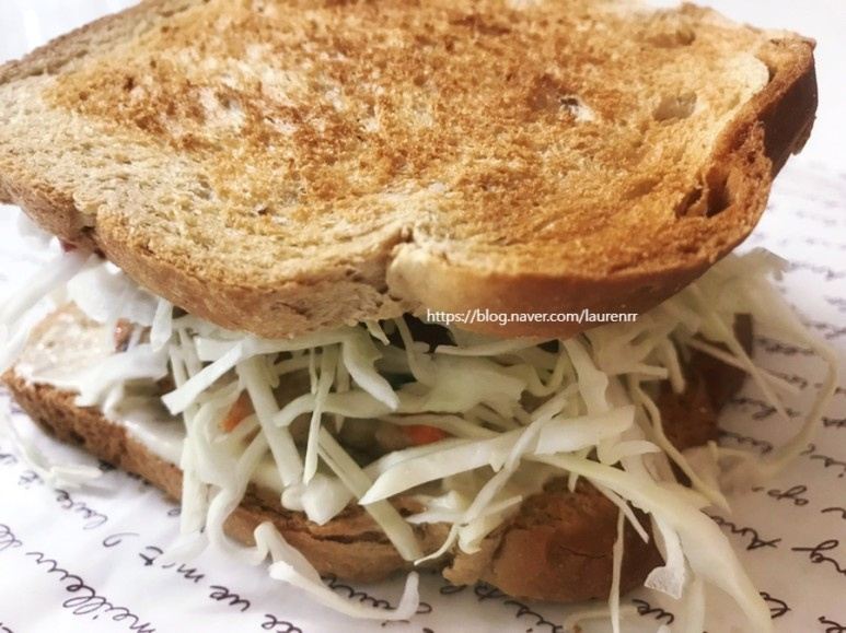 Finally, place the other slice of bread on top to complete your delicious Donggeurang-ttaeng Patty Cabbage Sandwich!