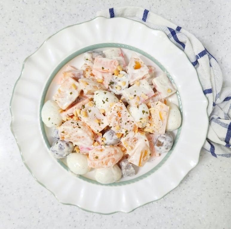 A trip down memory lane! This fruit salad, affectionately called ‘fruit sarada’ in Korea, is tossed in a rich and savory mayonnaise dressing that evokes cherished childhood memories. It’s a delightful dish that’s perfect when you need a burst of flavor. Load it up with your favorite fruits and enjoy this creamy, delightful creation!