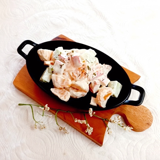First, peel the 3 tangerines and separate the segments. Wash the 2 persimmons, remove the core, and cut them into bite-sized pieces. Thinly slice the 1/2 cucumber. Shred or chop the 2 sticks of imitation crab meat.