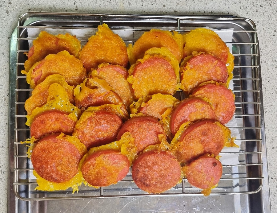 Now, heat a generous amount of oil in a pan over medium-low heat. Once the oil is moderately hot, dip the pink sausage slices into the tempura batter and place them in the pan. Don’t overcrowd the pan; leave a little space between each piece so they cook evenly and are easier to separate later.