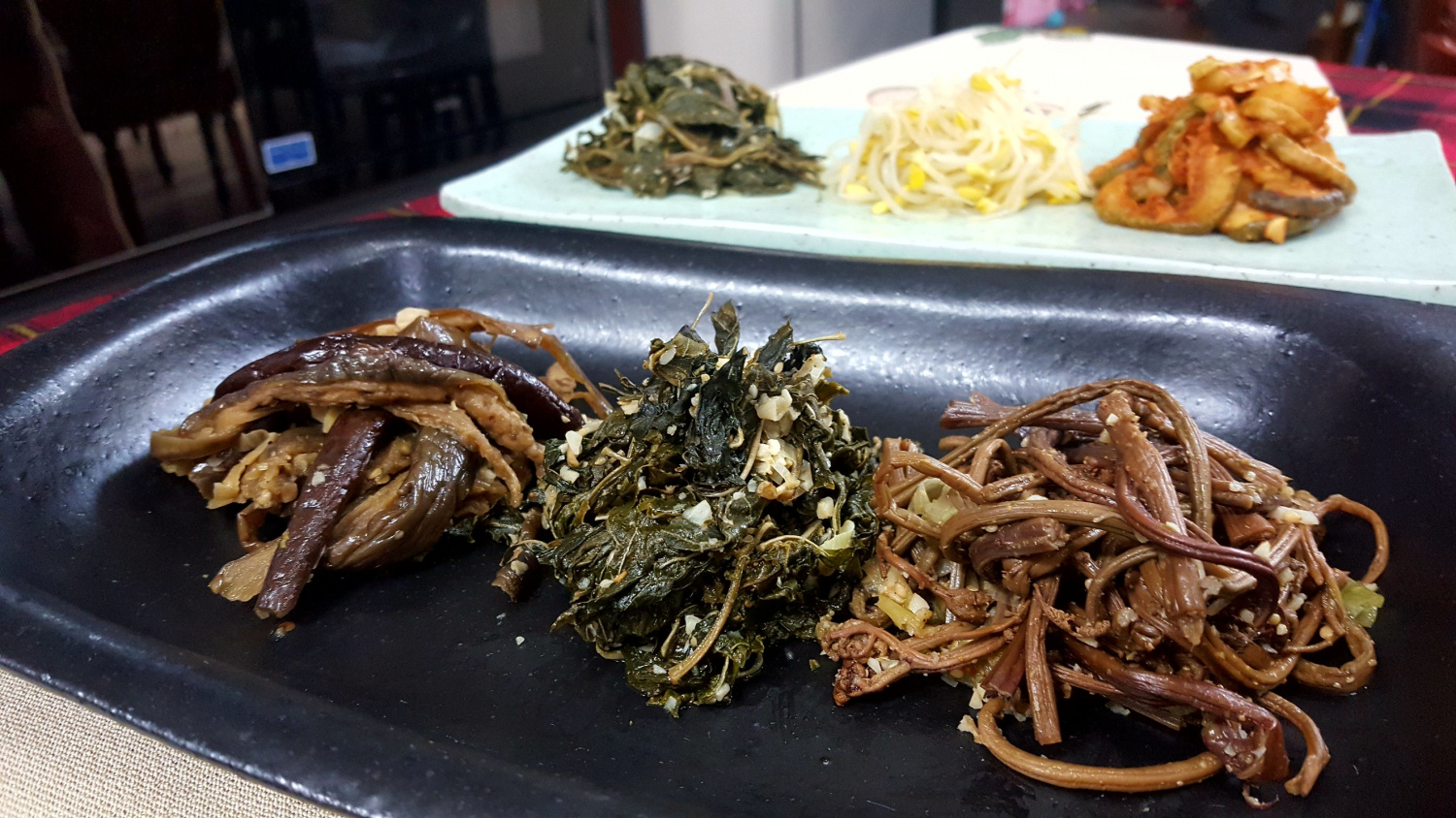 Squeeze out excess water from the soaked and boiled pumpkin vine shoots, dried daylily shoots, dried bracken fern, and dried chili leaves. Place each vegetable in separate bowls. For each vegetable, add 1 Tbsp soy sauce, 1 Tbsp minced garlic, and 1 Tbsp perilla oil. Gently massage the ingredients together to marinate and let them rest for about 10 minutes to absorb the flavors.