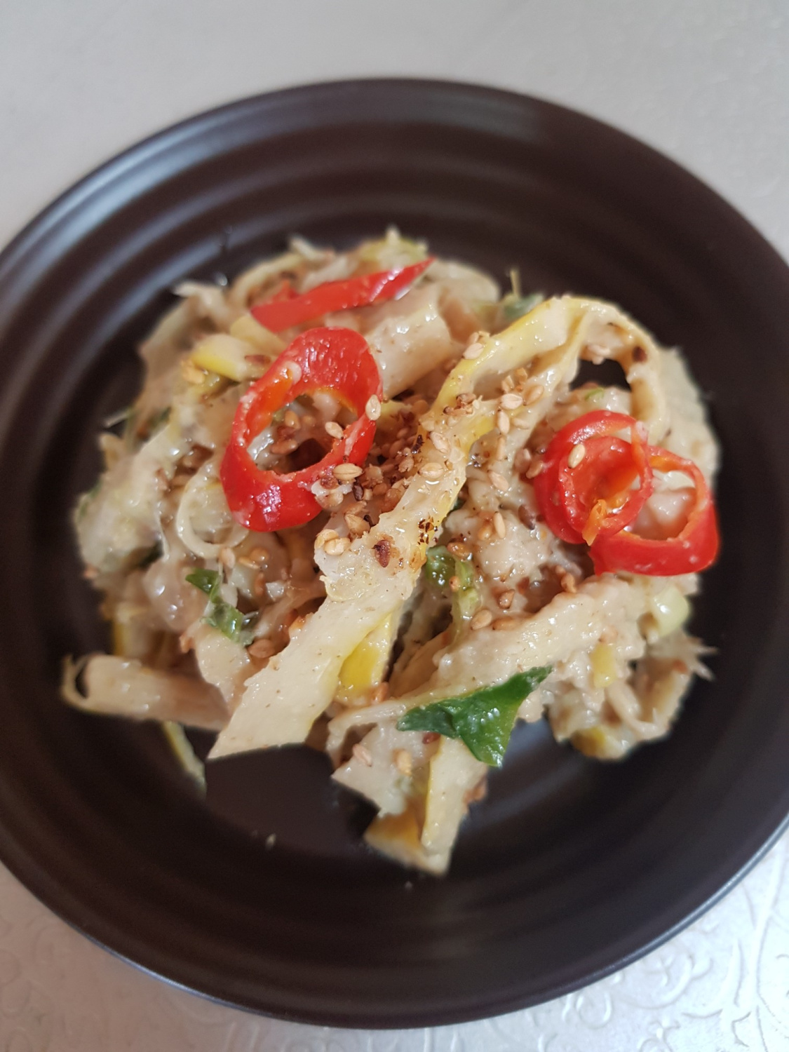Finally, arrange the stir-fried bamboo shoots attractively on a serving plate. If desired, garnish with thinly sliced red chili pepper for a pop of color and a hint of spice. Your delicious and nutritious bamboo shoot stir-fry with perilla seeds is now ready! Enjoy it as a side dish with warm rice.