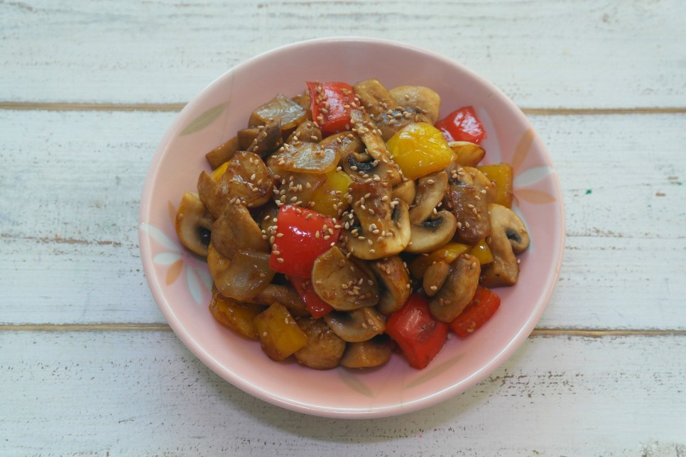 When the onions start to turn translucent and the bell peppers soften slightly, add the prepared button mushrooms and continue to stir-fry. Mushrooms release a lot of water, so cooking them over high heat quickly will prevent excess moisture and result in a tastier dish.