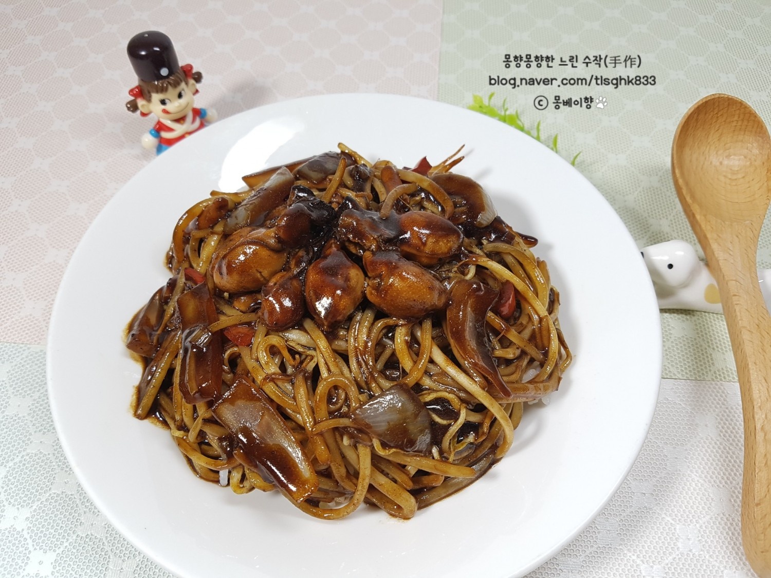 Special Jjajang Rice Featuring Crisp Bean Sprouts and Fresh Oysters Instead of Noodles