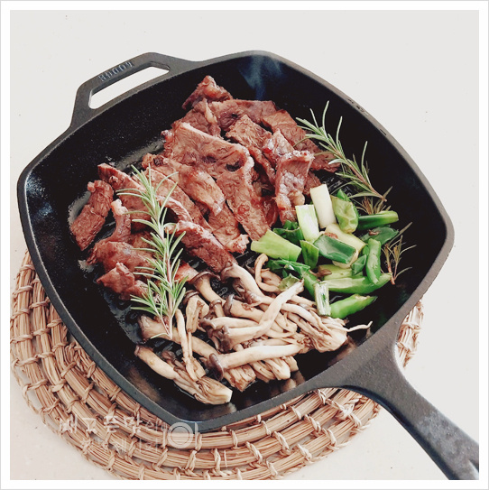 Prepare the vegetables to accompany your steak. Feel free to use whatever you have in your refrigerator! Separate 100g of oyster mushrooms into individual pieces. Cut 1 green onion into 2cm lengths. Slice 3 Cheongyang peppers diagonally for a touch of heat. If you want to add more fragrance, have some rosemary ready at this stage.