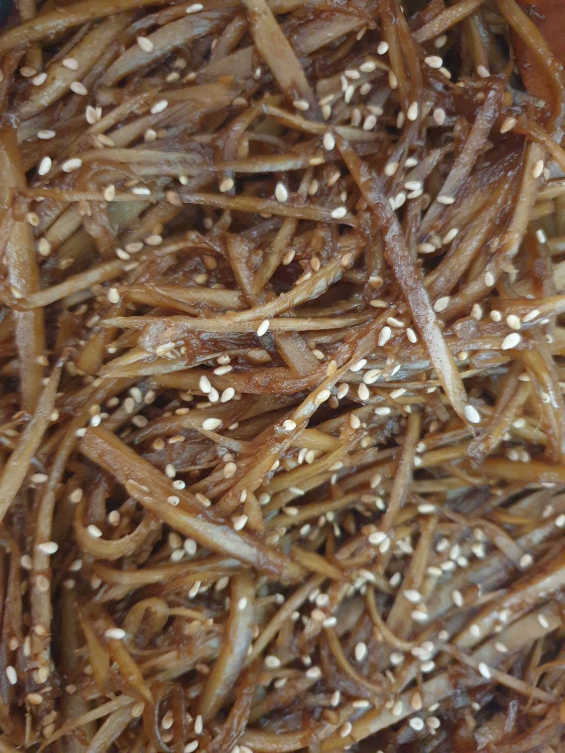 Turn off the heat. Drizzle in a teaspoon of sesame oil and sprinkle with toasted sesame seeds. Your delicious glazed burdock root is ready! Serve it with warm rice for a satisfying and healthy side dish that keeps well.