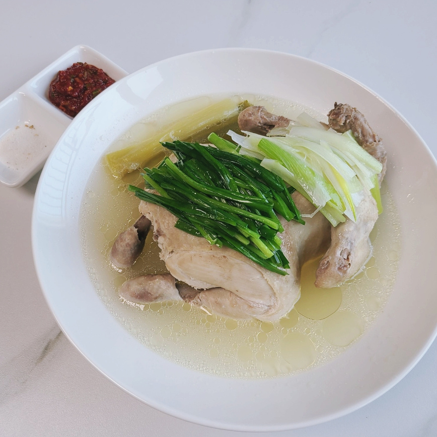 Place the tender cooked chicken in a serving bowl. Ladle a generous amount of the rich Samgyetang broth over the chicken. Finally, artfully arrange the blanched chives and green onions on top. Your delicious homemade Pot Samgyetang is now ready to be enjoyed! Serve with the prepared dipping sauce for an extra layer of flavor.