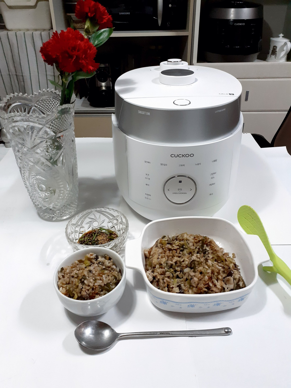 When you hear the completion beep, carefully open the lid. Gently mix the cooked eggplant and pork with the rice using a spatula, being careful not to mash the rice grains. Serve in bowls and enjoy with the prepared seasoning sauce! The delicious aroma of eggplant rice filling your mouth will bring warmth to your table. The design and functionality of the Cuckoo Twin Pressure Cooker are truly satisfying! I love it!
