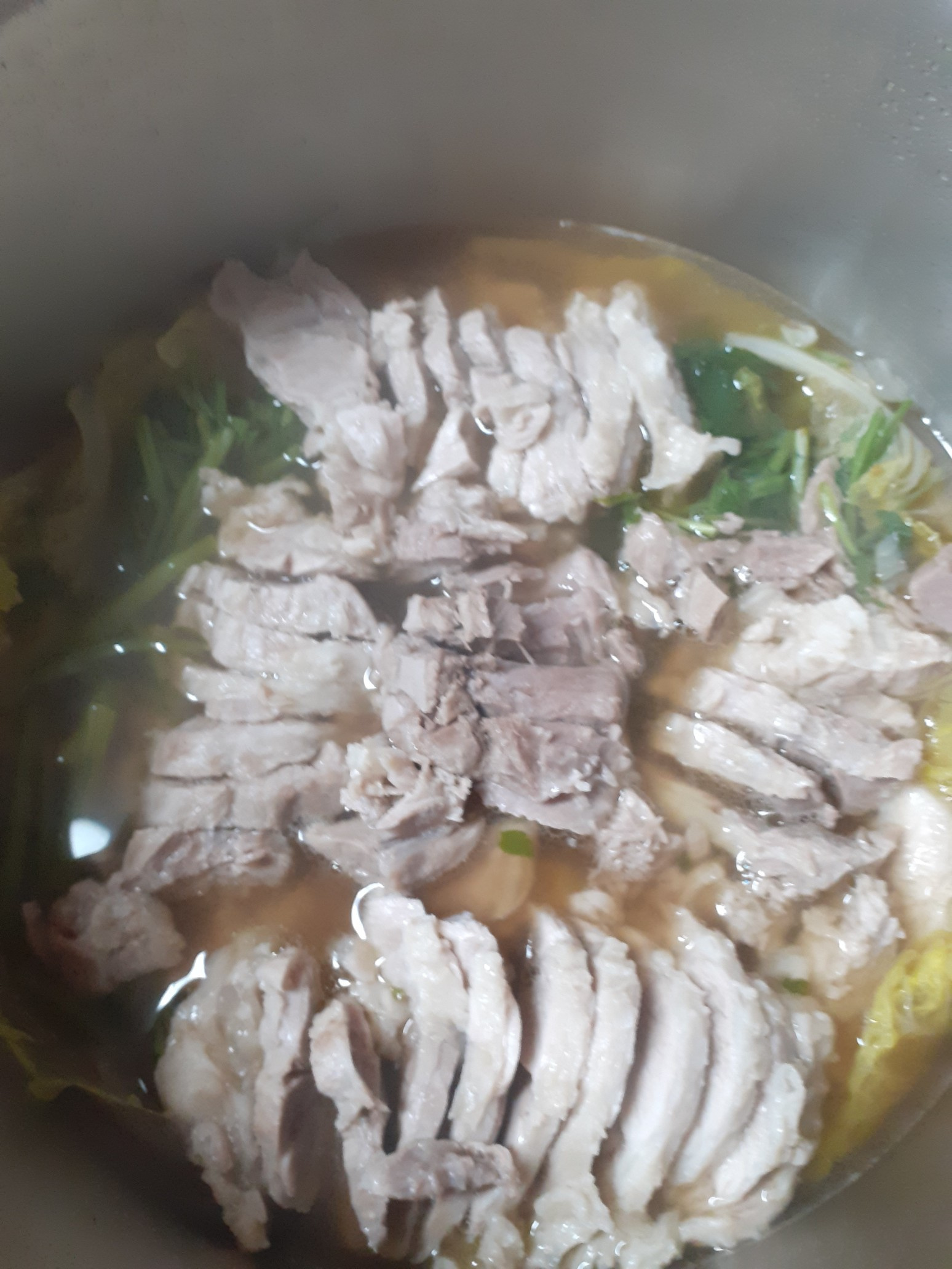 Once the pork is tender, let it cool slightly before slicing it thinly, about 0.5 cm thick. Carefully arrange the thinly sliced pork over the vegetables in the simmering hot pot. Continue to cook for another 5 minutes, allowing the flavors to meld and the pork to heat through.