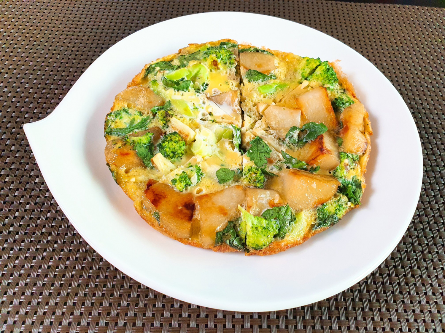 Lightly grease a small frying pan (around 18-20cm diameter) with cooking oil and heat over medium-low heat. Spread the prepared potatoes and broccoli evenly in the pan and sauté for 1-2 minutes. This step enhances the vegetables’ flavor and makes the frittata more delicious. Pour the whisked egg mixture evenly over the sautéed vegetables. Cover with a lid and cook slowly over very low heat for about 10-15 minutes, or until the eggs are fully set and the top is slightly puffed up. Tip: If the heat is too high, the bottom can burn easily, so be sure to cook it gently over low heat.