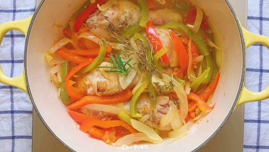 While the vegetables are simmering, season the chicken thighs with salt and pepper. In a separate skillet, heat a little oil and sear the chicken thighs on all sides until they are nicely browned and golden. This step adds extra flavor and color to the dish. (You can also deglaze the pan with white wine or a splash of soju at this point to lift any browned bits from the pan, though the recipe places this step later.)