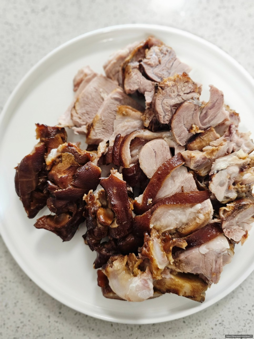 It’s time to serve your delicious homemade Jokbal! Using a sharp knife, slice the Jokbal in half along the bone side for easier handling. Then, slice the meat into approximately 1cm thick pieces. Your tender, juicy Jokbal is now ready to be enjoyed! Serve with salted shrimp sauce (saeujeot), ssamjang, garlic slices, and fresh lettuce wraps for the ultimate Korean dining experience.