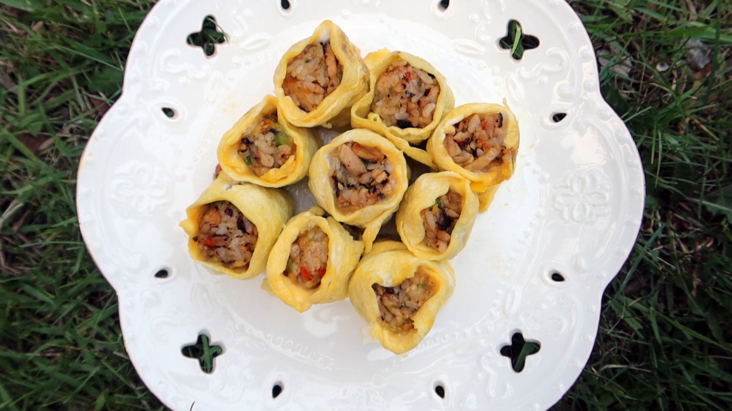 In a separate bowl, whisk together 3 eggs with a pinch of salt to create an egg wash. Heat a non-stick pan over medium-low heat and lightly grease it. Pour a thin layer of egg wash and let it cook until it’s about halfway set. Place one of the rice balls in the center of the semi-cooked egg and carefully roll the egg around the rice ball. Roll slowly to prevent the egg from tearing.