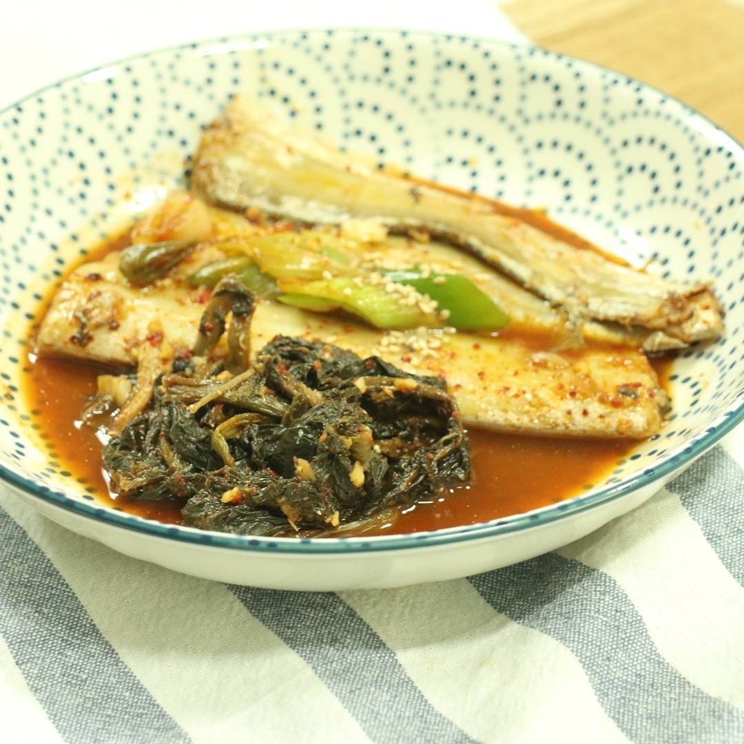 Once the fish starts to cook, gently flip the pieces to ensure they are evenly coated with the sauce. If the sauce seems too thick or has reduced too much, add a little more water. Adjust the seasoning if needed by adding more gochugaru for spice. Add the chopped green onion, then reduce the heat to medium.