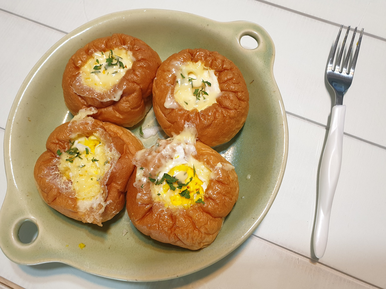 Using a knife or spoon, carefully hollow out the center of each morning bun to create a space for the egg. Work gently to avoid breaking the bread.