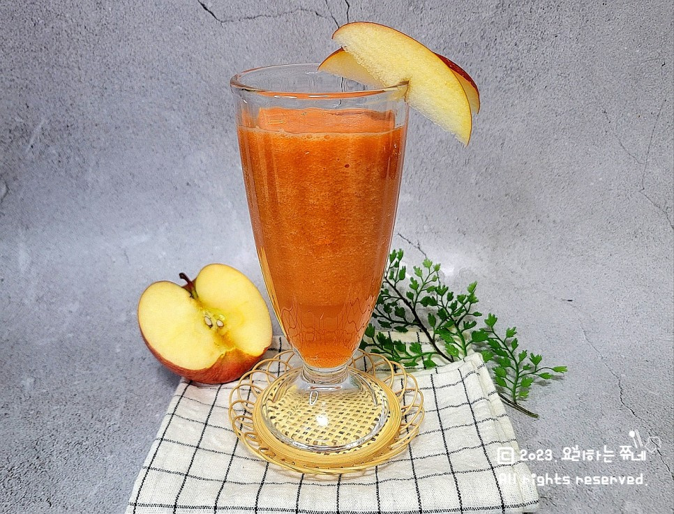 Carefully pour the finely blended apple carrot juice into a nice glass. Starting your day with this refreshing and nutrient-packed juice will surely make it more energetic and healthy! Enjoy your delicious and nutritious drink! ^^~