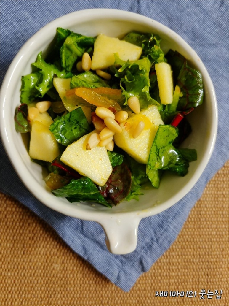 Arrange the dried salad greens and sliced apples attractively in a serving bowl. Drizzle the prepared yuzu dressing evenly over the salad. Sprinkle a generous amount of pine nuts on top for a delightful crunch and nutty flavor. If pine nuts aren’t available, feel free to use other nuts like walnuts or almonds, or even dried cranberries or raisins for a different kind of sweetness. If you don’t have any of these, the salad will still be delicious without them!