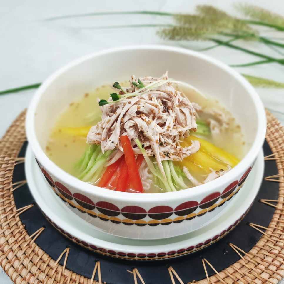 Finally, top the bowl with the prepared julienned vegetables and the seasoned shredded chicken. Your refreshing and delicious Chogye Guksu is ready to be enjoyed!