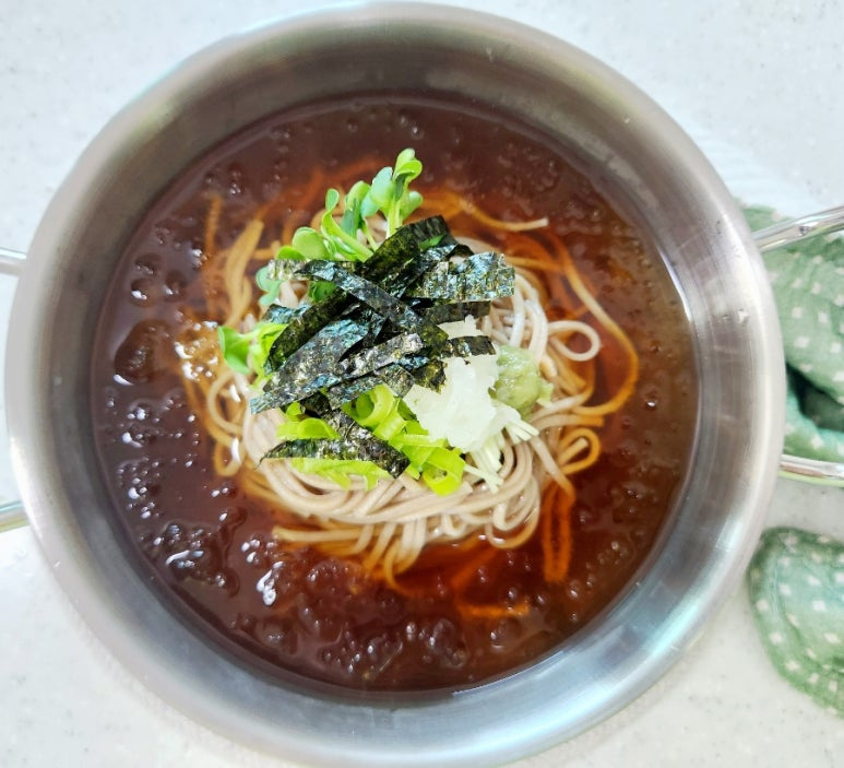 Drain the rinsed soba noodles well and arrange them neatly in a serving bowl. Pour the chilled, icy Tsuyu broth generously over the noodles. Finally, garnish with the chopped green onions, fresh sprouts, grated radish, a dab of wasabi, and a sprinkle of crumbled toasted seaweed. Your delicious and cooling cold soba is ready to be enjoyed! Bon appétit!