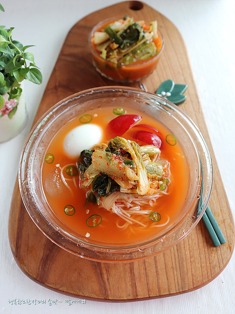 Chop the young napa cabbage kimchi into bite-sized pieces and generously top the noodles with it. Add about 1/2 cup of the kimchi brine to enhance the cool and spicy flavor of the kimchi.