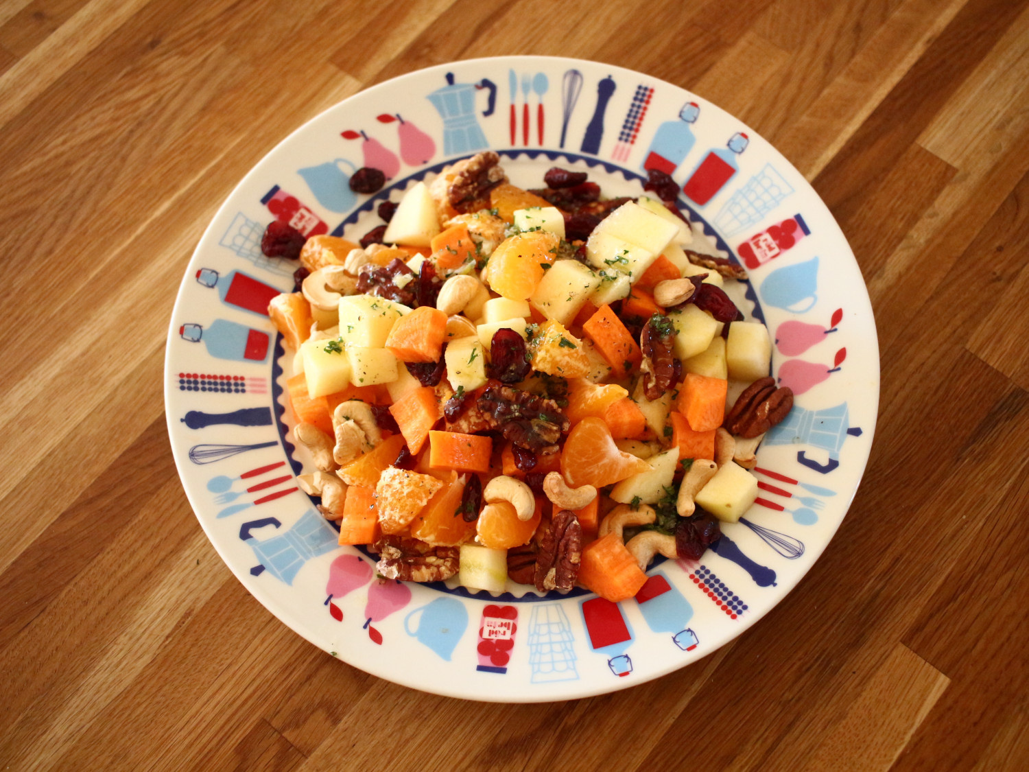 Prepare a large salad bowl. Add the diced apple, carrot, and tangerine segments. Toss in the dried cranberries and assorted nuts. Gently mix everything together to avoid bruising the fruits.