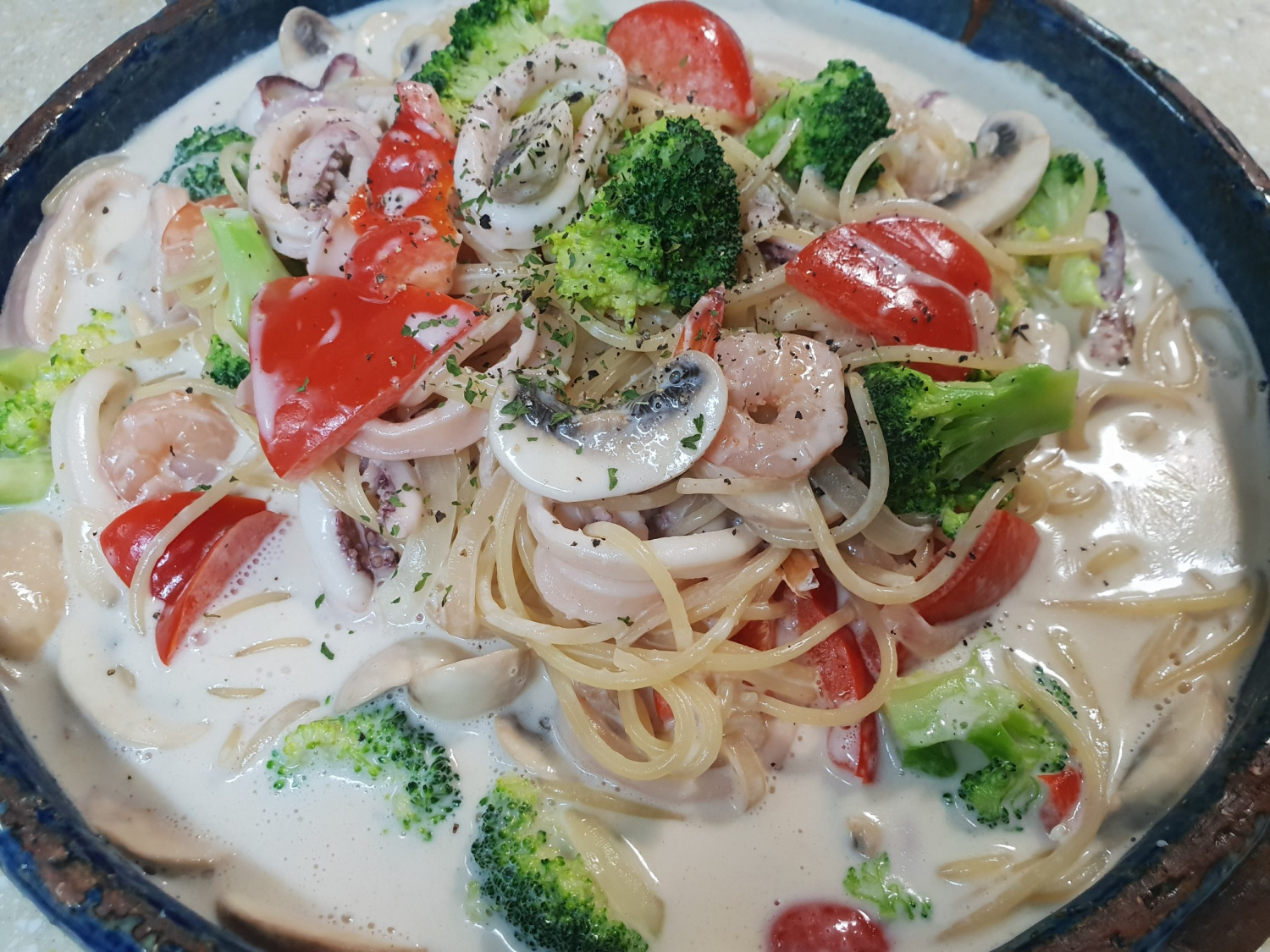 When the pasta is cooked to your desired doneness, return the reserved cooked seafood, mushrooms, broccoli, and red bell pepper to the pan with the sauce. Gently toss everything together to coat evenly with the creamy sauce. Let it simmer for another 1-2 minutes, just until all the ingredients are heated through. Avoid overcooking at this stage to maintain the texture of the vegetables and seafood.