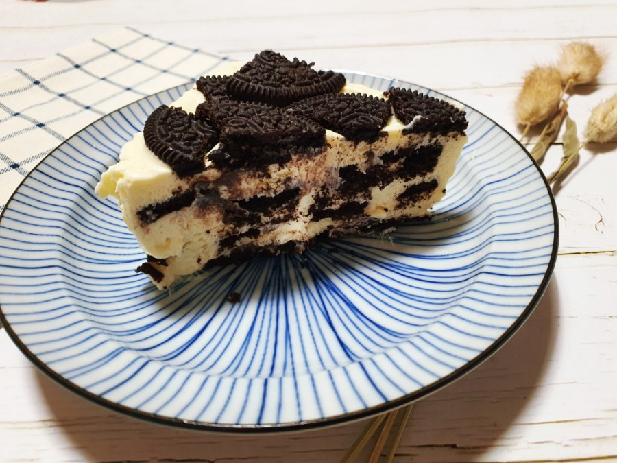 Build up the icebox cake with a total of 4 layers by alternating Oreo cookies and cream. Finish with a cream layer on top. You can sprinkle the remaining Oreo pieces on top for decoration or omit them. Smooth the top surface neatly.