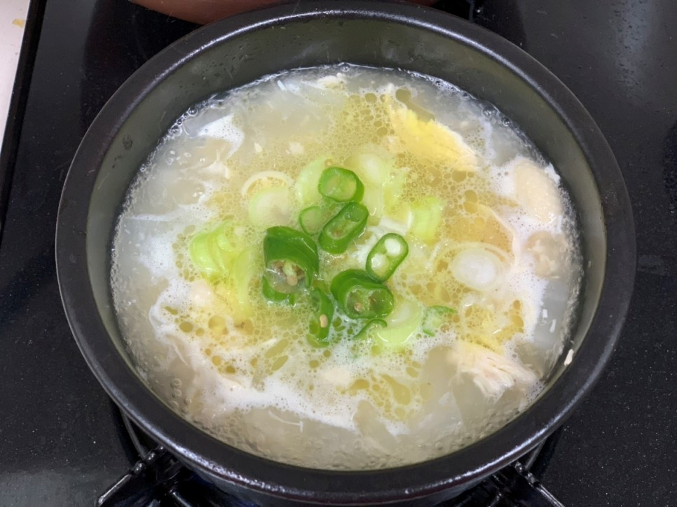 After simmering with the bones, the Dak Gomtang broth has become wonderfully rich and milky, almost like milk! Skim off any impurities that rise to the surface during simmering for an even cleaner taste.