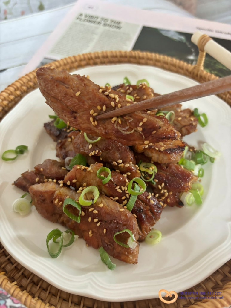 Chef Ryu Soo-young advises using ample oil and frying the ribs like a steak to replicate the smoky taste of charcoal grilling. Importantly, do NOT pour the marinade liquid into the pan while cooking, as this will steam the meat, turning it into a stew rather than grilled ribs. Also, lightly shaking off excess marinade before placing the meat in the pan helps create a delicious ‘wok hei’ (smoky) flavor on the ribs.