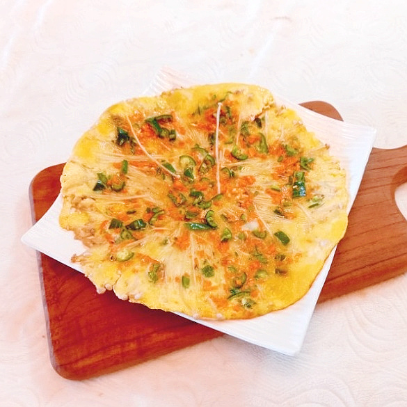 Cook over medium-low heat until the egg begins to set and the enoki mushrooms turn golden brown. Once the edges are cooked and the egg is mostly set, carefully flip the pancake using a spatula or a turning tool. Alternatively, if flipping is difficult, you can simply cook until the top layer of egg is fully set. Cooking both sides until golden brown will result in a crispier and tastier pancake.