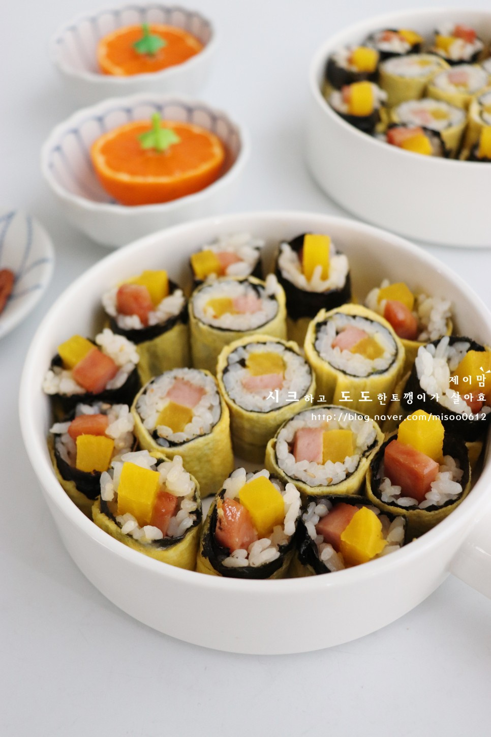 Adorable mini gimbap that fits perfectly in one bite! The combination of savory spam, crisp pickled radish, and soft egg coating makes for an exceptional taste and texture. It’s surprisingly not difficult to make, so be sure to try this recipe for your kids’ snacks or for a special lunchbox treat!