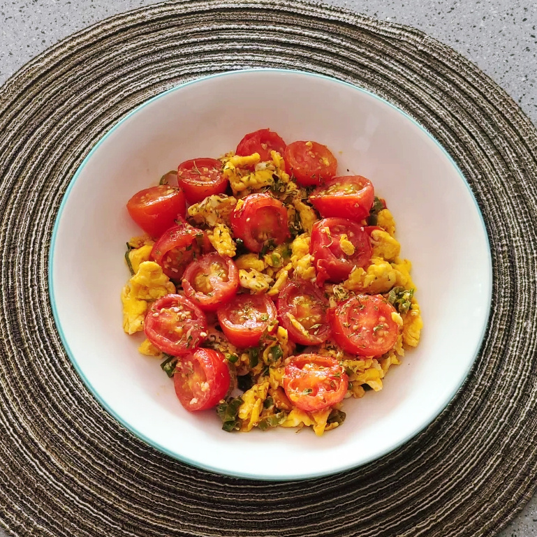 First, prepare your ingredients: 22g of green onion, 2 fresh eggs, and 8 sweet cherry tomatoes.