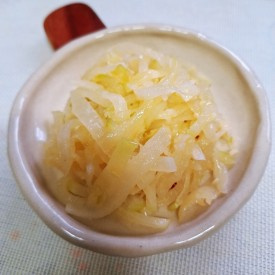 Prepare a wide and deep wok or pan. Add the julienned radish and onion, 1 tablespoon of salt, and 4 tablespoons of perilla oil. Gently mix them with your hands to season. Letting the radish marinate for a bit will enhance the flavor.