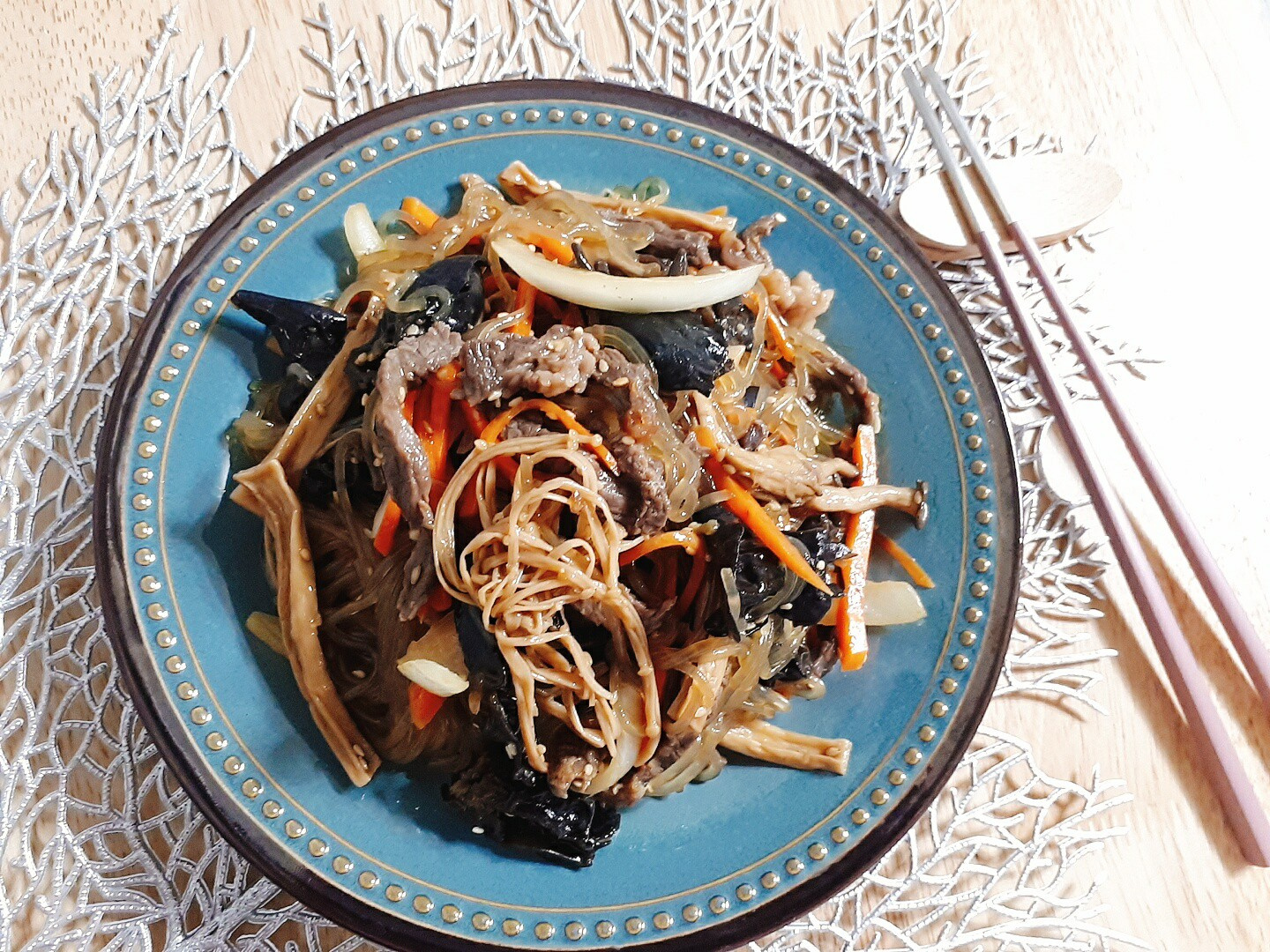 Savory Beef and Mushroom Japchae: A Festive Korean Noodle Dish