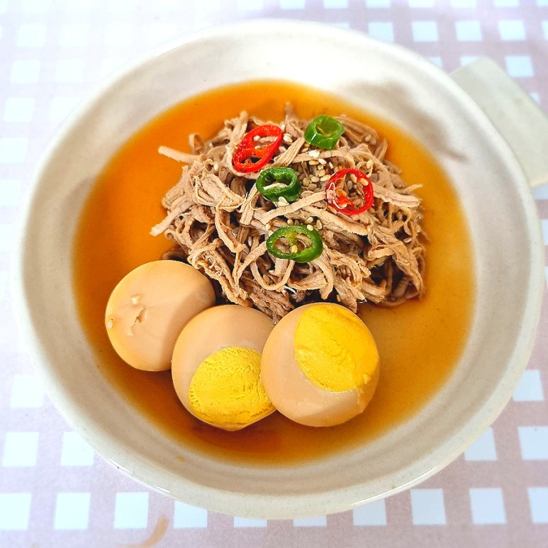 Finished Braised Dish: Behold the finished braised pork and eggs! The thinly shredded pork and infused eggs have perfectly absorbed the delicious soy sauce. Enjoy this delightful dish with a bowl of warm rice!