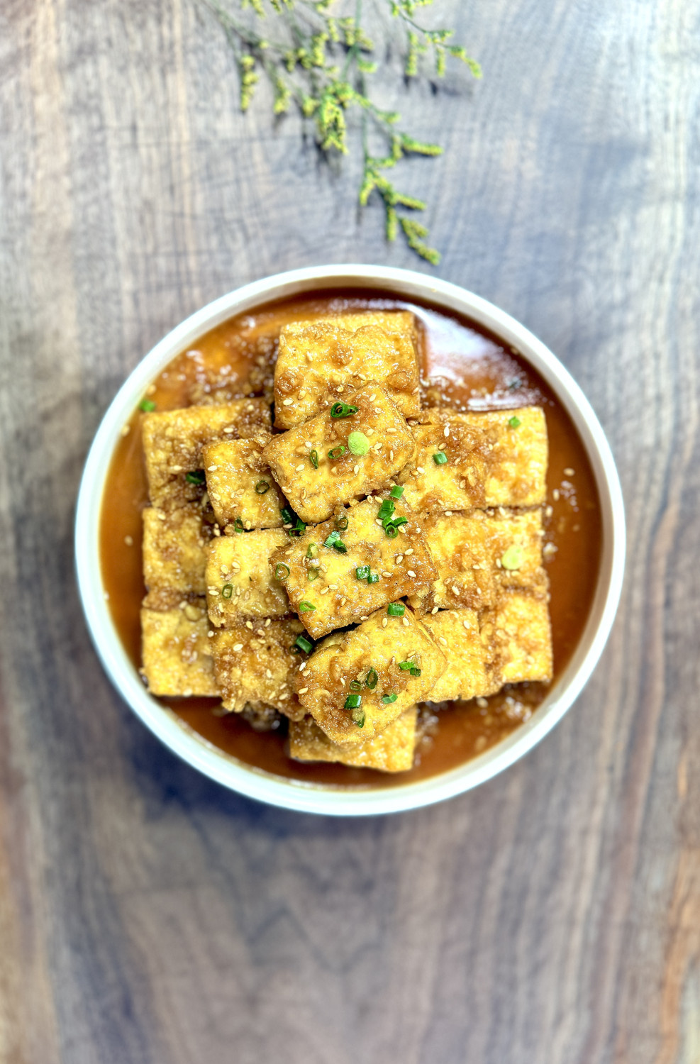 When braising the tofu, we will fry it without coating it in flour or starch. This method prevents the braising liquid from becoming gummy or overly thick.