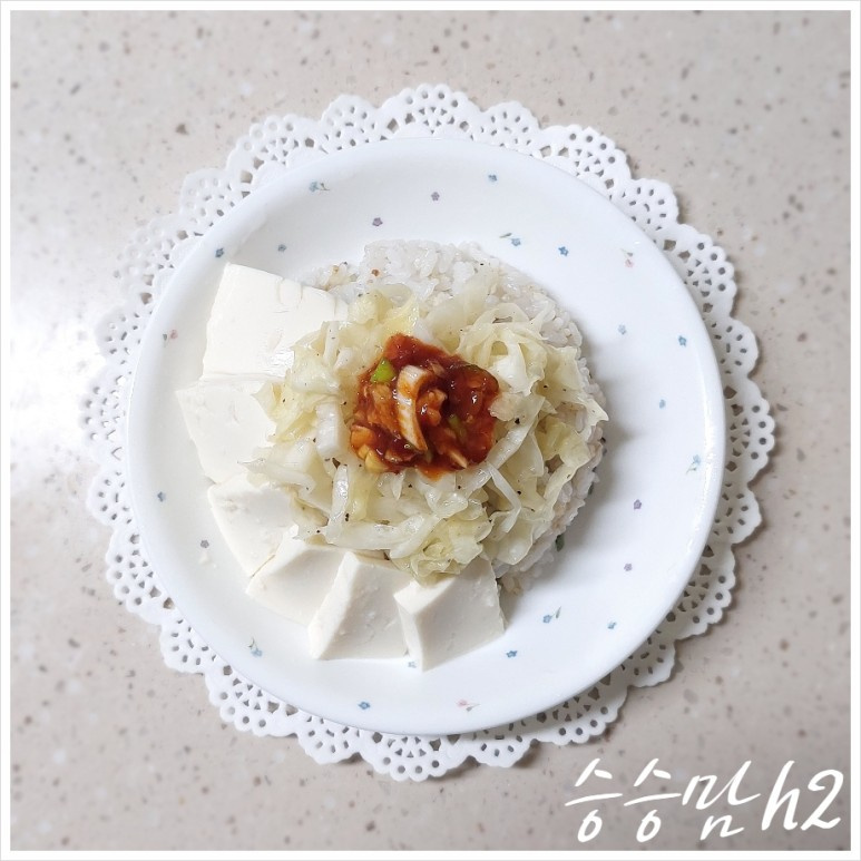 Generously spoon the stir-fried cabbage over the silken tofu. Drizzle the prepared doubanjiang sauce over the cabbage. Mix everything together – the rice, cabbage, tofu, and sauce – until well combined. Enjoy this delicious rice bowl! If you prefer a spicier kick, feel free to add a little gochujang (Korean chili paste) to the sauce.