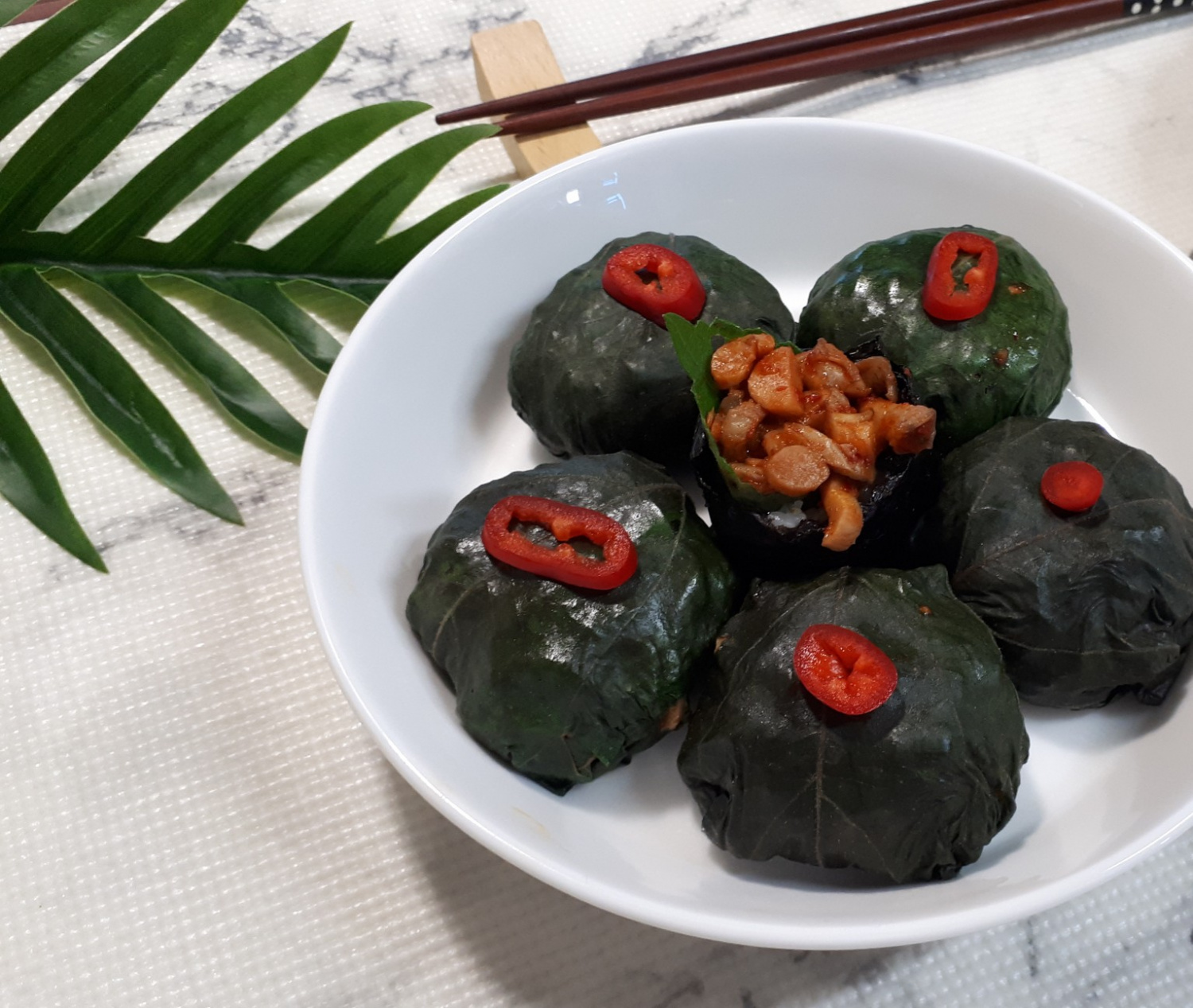 Scoop a portion of the seasoned rice onto the mushrooms and then wrap the Perilla Leaf around the rice to form a compact, round ball. The combination of the fresh perilla and the savory mushrooms is simply delightful.
