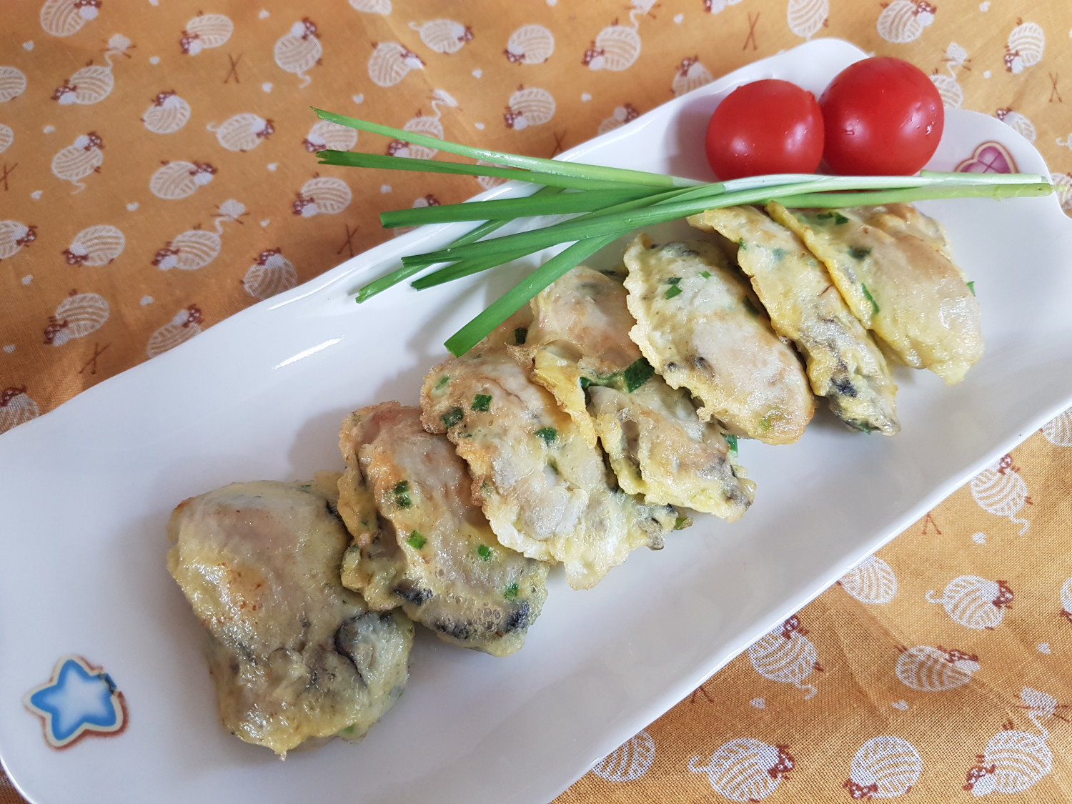 Heat a frying pan over medium-low heat and add a generous amount of cooking oil. Spoon portions of the floured oysters into the pan. Since the oysters will release some liquid and the egg batter will cook, it’s important to maintain a low heat to prevent burning and ensure even cooking. Fry until golden brown on both sides.