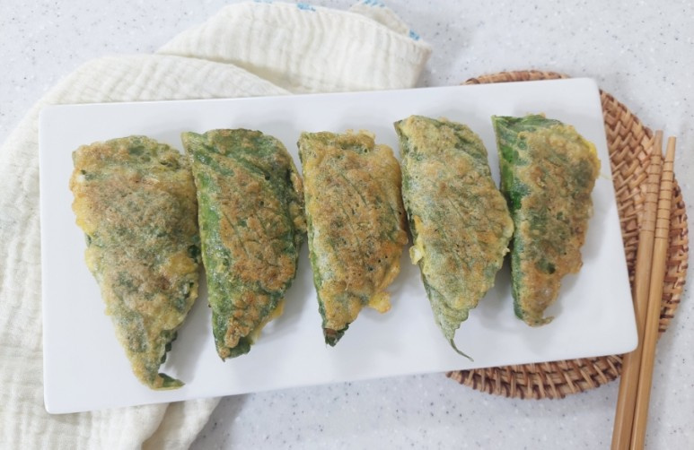 It’s time to cook the pancakes! Heat a generous amount of cooking oil in a frying pan over medium heat. Once the oil is shimmering, carefully place the egg-coated perilla leaf pancakes into the pan. Fry them until they are golden brown on both sides.