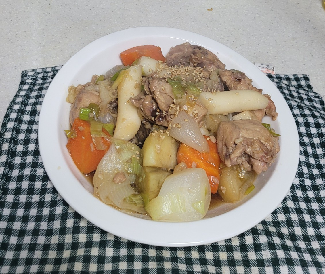 Transfer the jjimdak to a serving platter. Spoon some of the rich soy sauce glaze over the rice cakes to ensure they are coated and look appetizing.