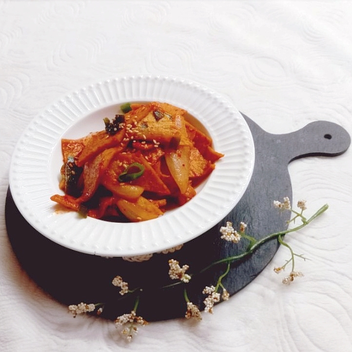 First, prepare the ingredients. Slice the square fish cakes into strips about 0.5-1 cm thick. Thinly slice the onion, and slice the green onion diagonally. If you like a bit of heat, finely chop the Korean chili pepper. These prep steps will ensure even cooking and great flavor.